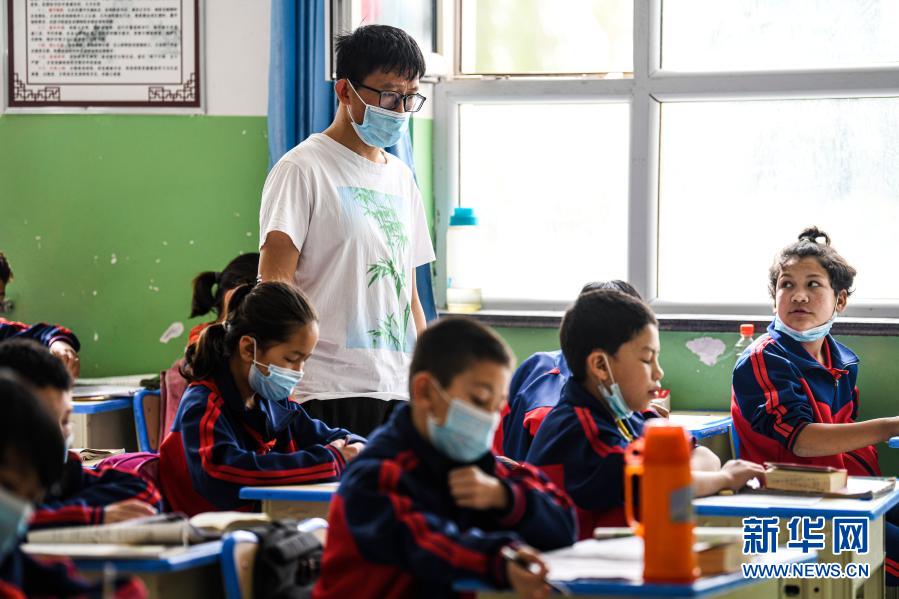 在新疆和田县塔瓦库勒乡巴克墩小学四年级教室中,支教老师在给学生们上课(5月16日摄)。