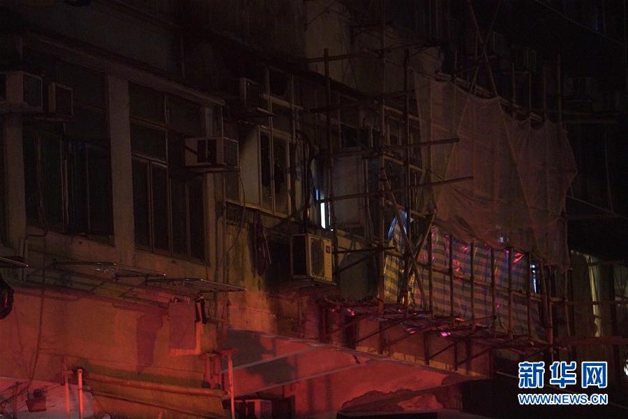 发生火灾的老式居民楼(11月15日摄)。 香港九龙佐敦广东道560号一座老式居民楼15日夜起火。香港特区政府新闻处向新华社记者证实,火灾已经造成17人被送医院抢救,截至零点有7人遇难、10人受伤。 新华社记者 吕小炜 摄