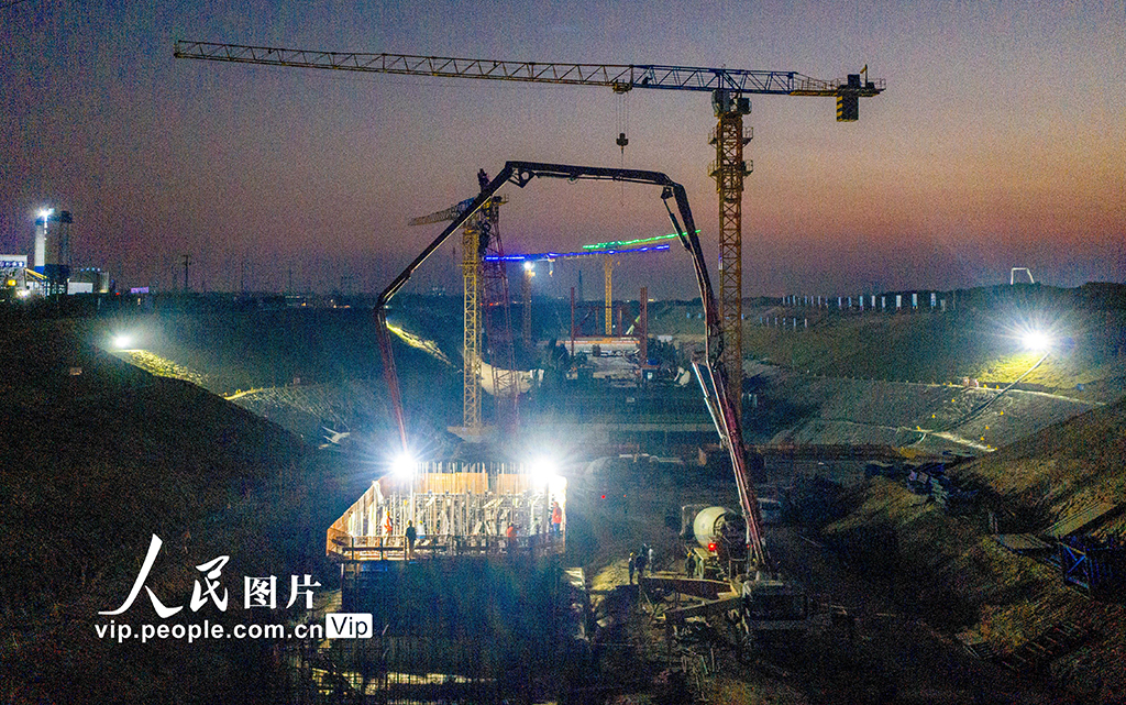 2020年11月15日,引江济淮工程安徽省合肥市庐江县庐城镇庐江节制闸施工现场,建设者们正挑灯夜战加快工程进度。