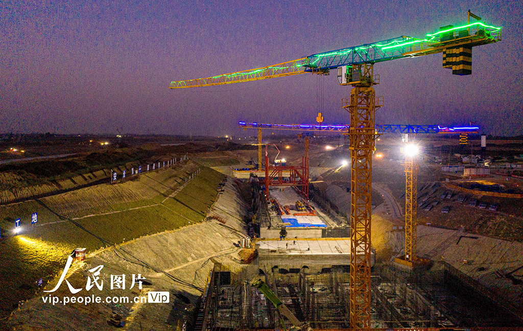2020年11月15日,引江济淮工程安徽省合肥市庐江县庐城镇庐江节制闸施工现场,建设者们正挑灯夜战加快工程进度。