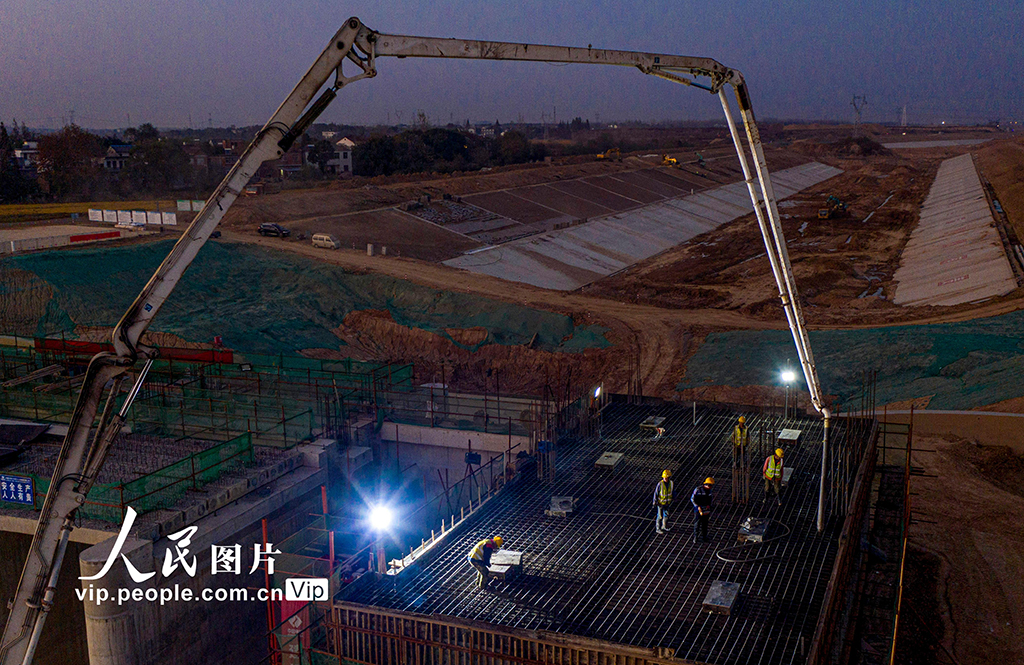 2020年11月15日,引江济淮工程安徽省合肥市庐江县庐城镇庐江节制闸施工现场,建设者们正挑灯夜战加快工程进度。