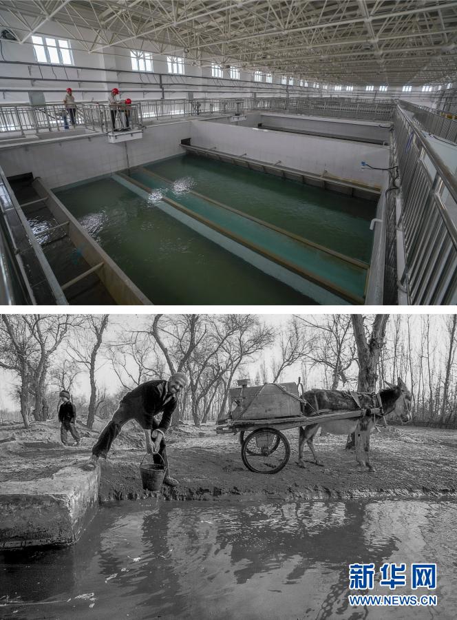拼版照片:上图为2020年6月8日,在新疆喀什地区城乡供水总水厂,工作人员检查清水池工作情况。这些安全水将通过近112公里的主管道直达伽师县,供应当地居民用水(新华社记者 赵戈 摄);下图为20世纪90年代,新疆和田地区策勒县一名农民在一处涝坝边取水(新华社记者 沈桥 摄)。新华社发