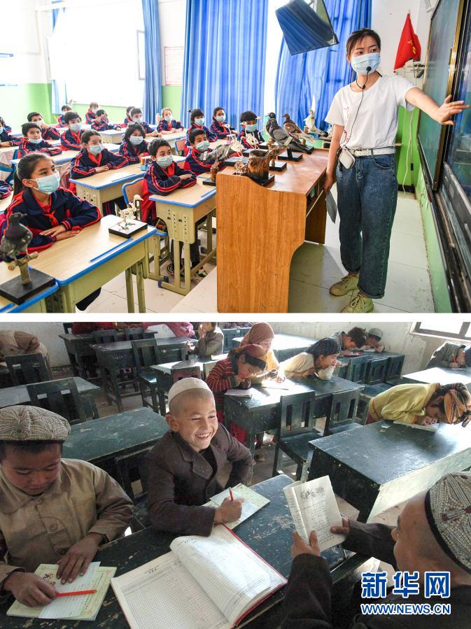 拼版照片:上图为2020年5月16日,在地处塔克拉玛干沙漠腹地的新疆和田县塔瓦库勒乡巴克墩小学,支教老师在给学生讲解科普知识(新华社记者 王菲 摄);下图为2005年11月7日,新疆于田县达里雅布依乡寄宿学校的孩子们在上自习课(资料照片)。新华社发