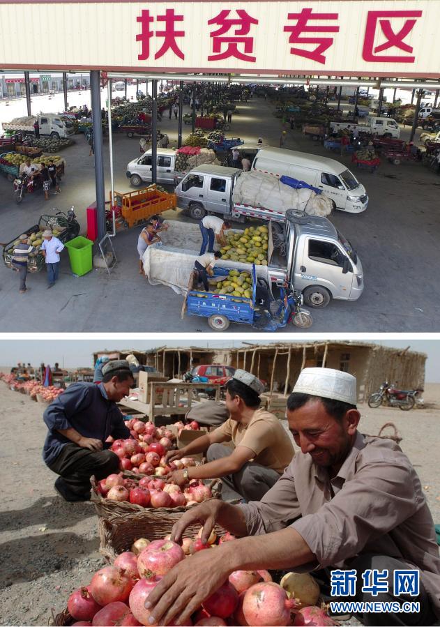 拼版照片:上图为2019年8月10日拍摄的新疆果品(伽师)批发交易市场扶贫专区。为贫困户设立的扶贫专区占市场面积的三分之二,瓜农可以在扶贫专区免费交易(无人机照片,新华社记者 丁磊 摄);下图为2004年9月22日,在新疆和田地区皮山县皮亚勒玛乡,当地农民在路旁推销自家的石榴(新华社记者 罗晓光 摄)。新华社发