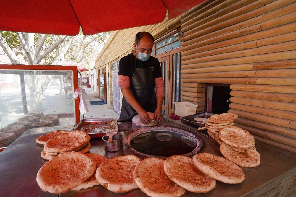 ↑ 在新疆墨玉县阿克萨拉依乡乌尊艾日克村,村民在制作馕(10月22日摄)。新华社记者 赵戈 摄