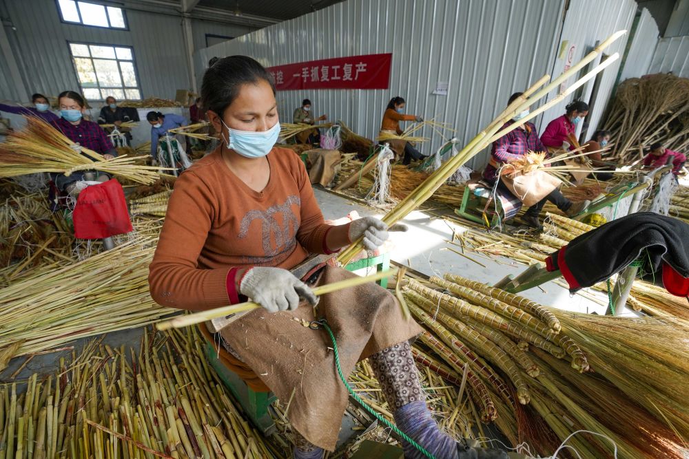 ↑ 在新疆墨玉县阿克萨拉依乡乌尊艾日克村佳美扫把制作中心,当地村民在制作扫把(10月22日摄)。新华社记者 赵戈 摄