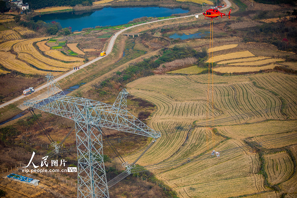 当日,在安徽合肥庐江境内±1100千伏吉泉线特高压输电线路,国网安徽电力和国网通航公司检修人员在百米高空进入电场,对缺陷进行带电处置。一架直升机用吊篮搭载着检修人员匀速升空,慢慢靠近特高压线路,将吊篮上的检修人员精准放置在作业位置。经过近2个小时空中带电作业,国家电网有限公司成功完成世界首次±1100千伏吉泉线直升机带电检修任务,消除了±1100千伏吉泉线上的安全隐患,保障长三角电力供应的重要支撑。王文 摄(人民图片网)
