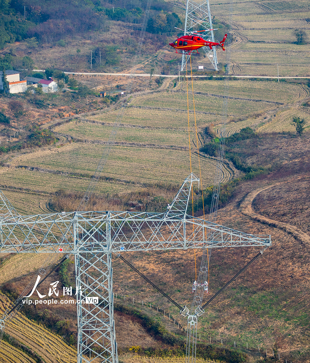 当日,在安徽合肥庐江境内±1100千伏吉泉线特高压输电线路,国网安徽电力和国网通航公司检修人员在百米高空进入电场,对缺陷进行带电处置。一架直升机用吊篮搭载着检修人员匀速升空,慢慢靠近特高压线路,将吊篮上的检修人员精准放置在作业位置。经过近2个小时空中带电作业,国家电网有限公司成功完成世界首次±1100千伏吉泉线直升机带电检修任务,消除了±1100千伏吉泉线上的安全隐患,保障长三角电力供应的重要支撑。王文 摄(人民图片网)
