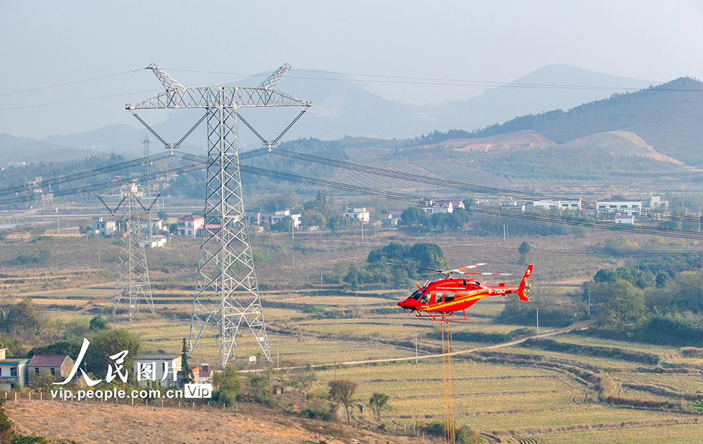当日,在安徽合肥庐江境内±1100千伏吉泉线特高压输电线路,国网安徽电力和国网通航公司检修人员在百米高空进入电场,对缺陷进行带电处置。一架直升机用吊篮搭载着检修人员匀速升空,慢慢靠近特高压线路,将吊篮上的检修人员精准放置在作业位置。经过近2个小时空中带电作业,国家电网有限公司成功完成世界首次±1100千伏吉泉线直升机带电检修任务,消除了±1100千伏吉泉线上的安全隐患,保障长三角电力供应的重要支撑。王文 摄(人民图片网)