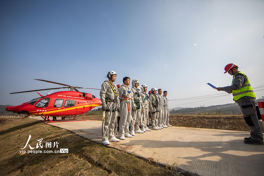 当日,在安徽合肥庐江境内±1100千伏吉泉线特高压输电线路,国网安徽电力和国网通航公司检修人员在百米高空进入电场,对缺陷进行带电处置。一架直升机用吊篮搭载着检修人员匀速升空,慢慢靠近特高压线路,将吊篮上的检修人员精准放置在作业位置。经过近2个小时空中带电作业,国家电网有限公司成功完成世界首次±1100千伏吉泉线直升机带电检修任务,消除了±1100千伏吉泉线上的安全隐患,保障长三角电力供应的重要支撑。王文 摄(人民图片网)