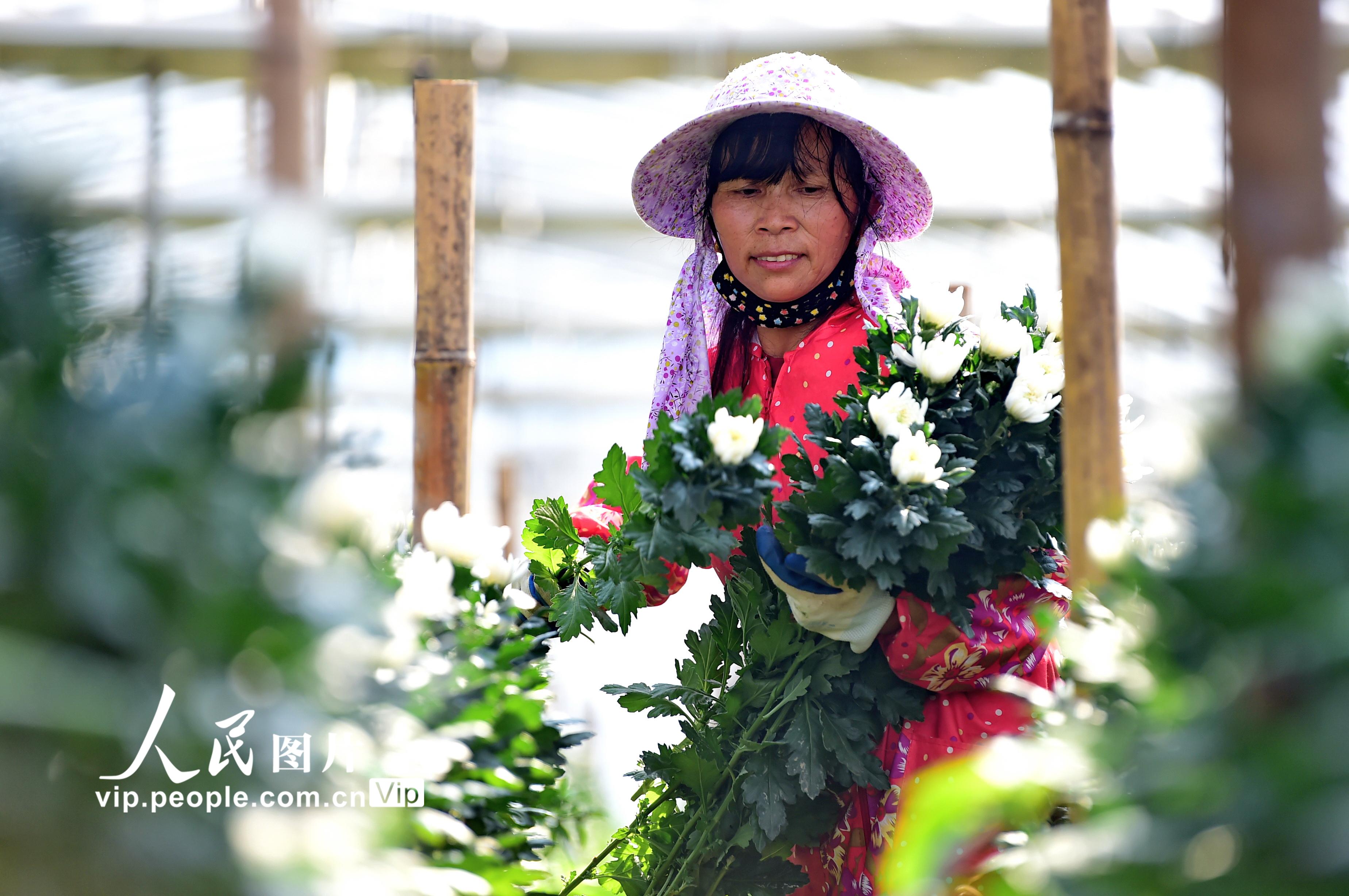 2020年11月16日,江西省赣州市会昌县小密乡半迳村,花农在鲜切花种植基地大棚里采摘小菊花。