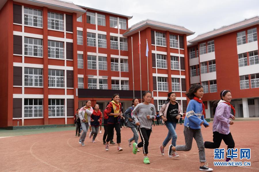 四川省布拖县阿布泽鲁小学的学生们在新操场上跑步(6月22日摄)。