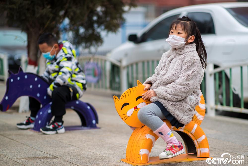 11月17日,小朋友在呼和浩特市玉泉区小召前街街道办事处垃圾分类主题广场旧物改造再利用展示区玩耍。(丁根厚 摄)