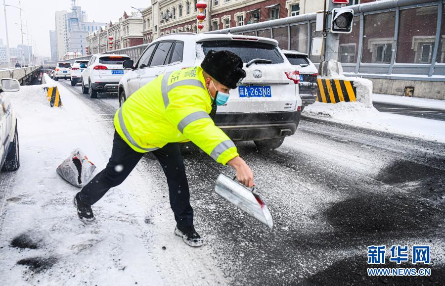 11月19日,乌鲁木齐市公安局交警支队城市快速路大队外环路中队民警王健羽在北京路执勤点往匝道处路面上倾洒煤渣以防车辆打滑。