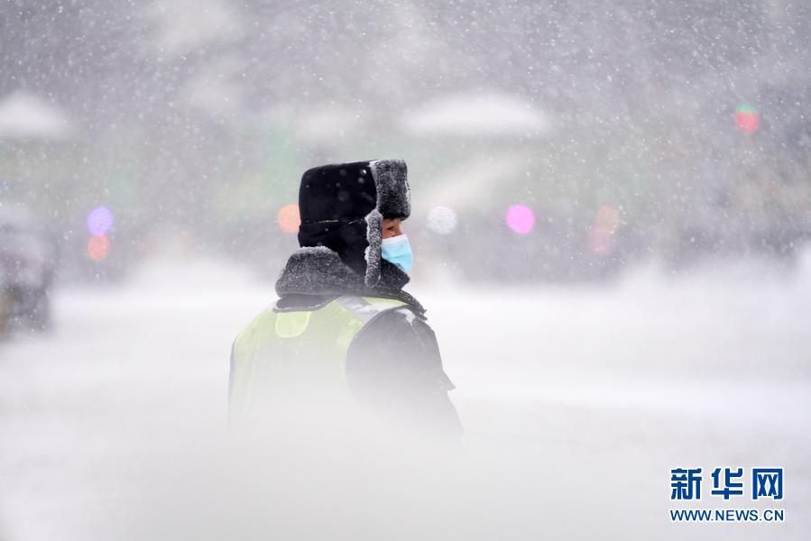11月19日,在哈尔滨市中山路,交警在雪中指挥交通。