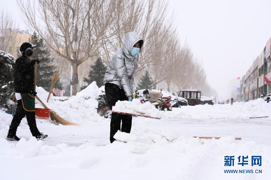 11月19日,赤峰市敖汉旗新惠镇居民自发清理路面积雪。新华社记者 张晟 摄