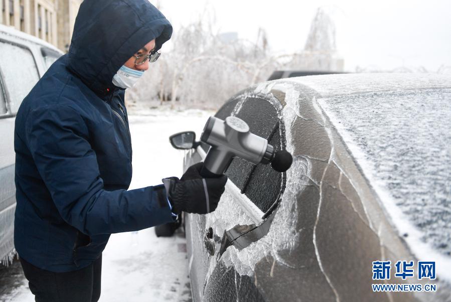 11月19日,长春市民清理汽车上的冰。11月18日至19日,吉林长春遭遇罕见强雨雪大风冰冻天气,气象部门连续发布暴雪、大风、道路冰雪等预警信号。19日上午,吉林省将重大气象灾害(雪灾、冻害、大风)Ⅳ级应急响应升级至Ⅲ级。新华社记者 许畅 摄
