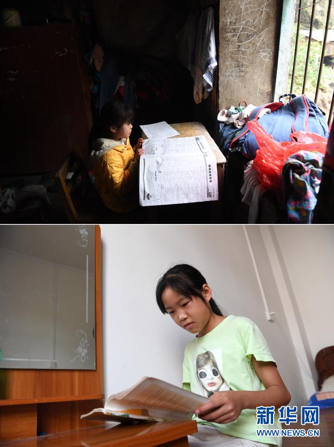 这是一张拼版照片:上图是在广西都安瑶族自治县下坳镇加八村,白雨璐在家中学习(2017年2月9日摄);下图是在广西都安瑶族自治县下坳镇车家庄易地扶贫搬迁安置新区,白雨璐在新家学习(2020年8月18日摄)。