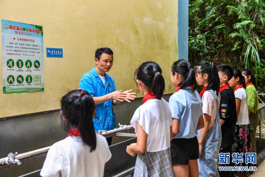 广西金秀瑶族自治县长垌乡卫生院的瑶族医生陶雷在给小学生讲解正确的洗手方法(7月8日摄)。