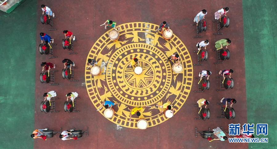 在广西大化瑶族自治县六也乡六也中心小学,来自贫困山村的孩子们在进行铜鼓合奏排练(9月5日摄,无人机照片)。