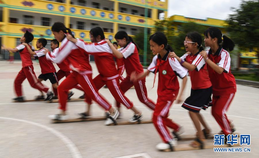在广西大化瑶族自治县六也乡六也中心小学,来自贫困山村的孩子们在大课间开展三人板鞋竞速比赛(9月14日摄)。