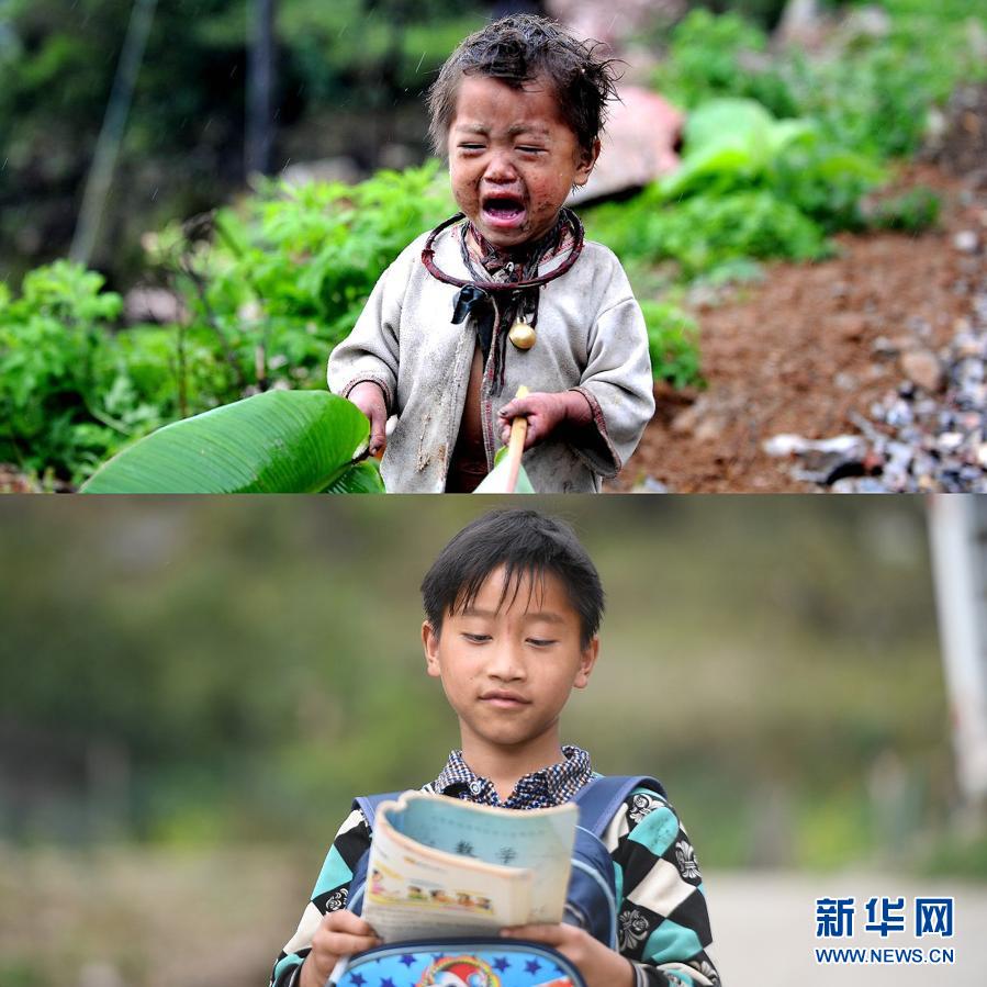 这是一张拼版照片:上图是广西那坡县那布村水弄一社陶美星儿时照片(2009年4月5日摄);下图是陶美星在周末放学路上(2018年3月17日摄)。