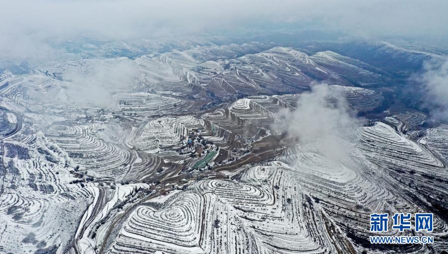 雪后的宁夏固原市彭阳县金鸡坪梯田公园(4月1日摄,无人机照片)。