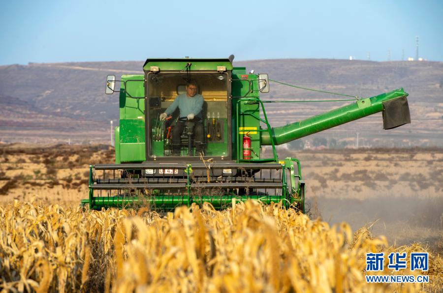 在宁夏中卫市海原县贾塘乡王塘村,联合收割机在收割谷子 (2019年10月29日摄)。新华社记者 杨植森 摄