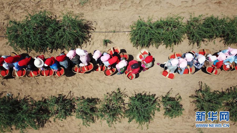 宁夏吴忠市红寺堡区的移民在大河乡百瑞源枸杞种植基地排队将采摘的枸杞称重(2018年5月30日摄,无人机照片)。新华社记者 王鹏 摄