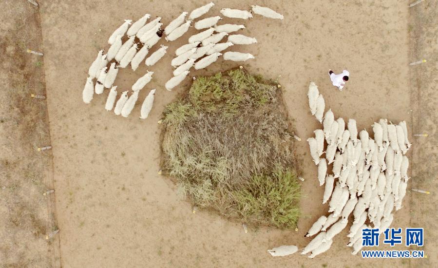 宁夏吴忠市盐池县花马池镇,返乡创业大学生冯欢在羊场里的滩羊跑道上驱赶羊群“跑步锻炼”(2019年5月27日摄,无人机照片)。新华社记者 王鹏 摄