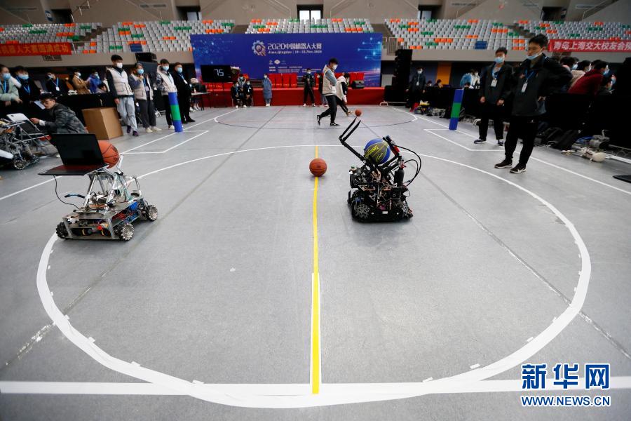 11月20日,参赛选手在进行篮球机器人比赛。新华社发(梁孝鹏 摄)