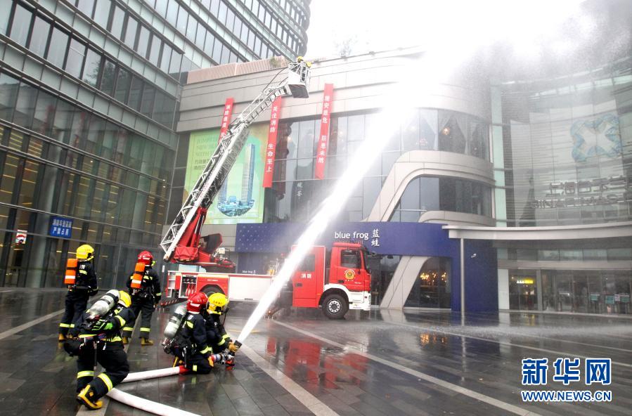 11月20日,消防员在上海白玉兰广场开展大型商场的火灾扑救演练。