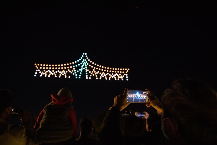 当晚,一场无人机表演亮相昆明夜空,灯光变幻引得游人驻足。据介绍,本次表演共使用无人机200架,是作为昆明迎接《生物多样性公约》第十五次缔约方大会所开展的系列活动之一。新华社发(王冠森 摄)