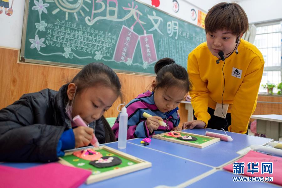 11月20日,在太原市晋源区一电学校,朱霞为孩子们上沙画课。
