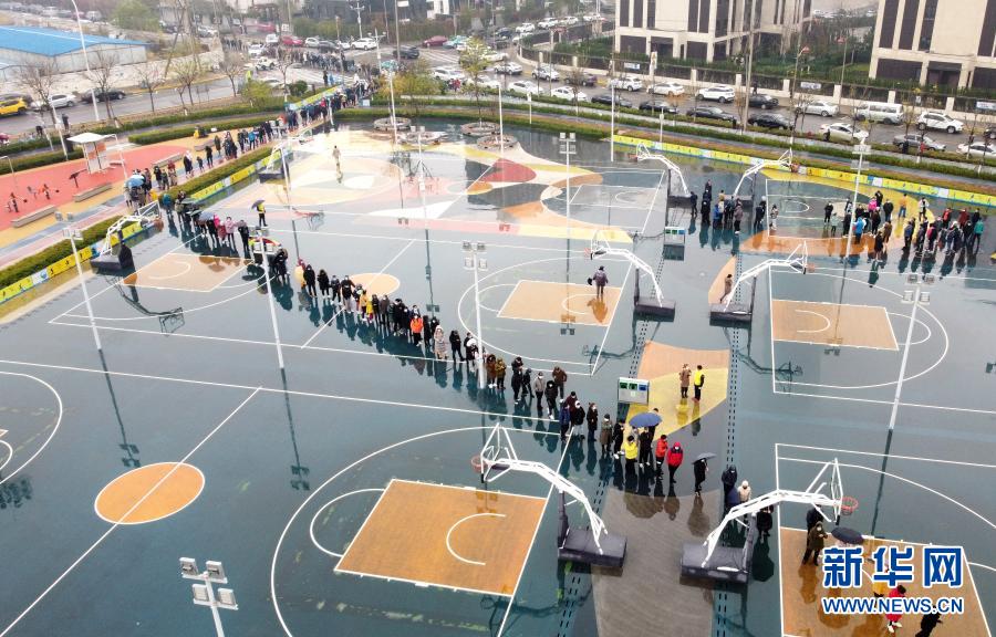 11月21日,天津滨海新区居民在泰达第二体育场核酸检测点排队等候核酸检测(无人机照片)。