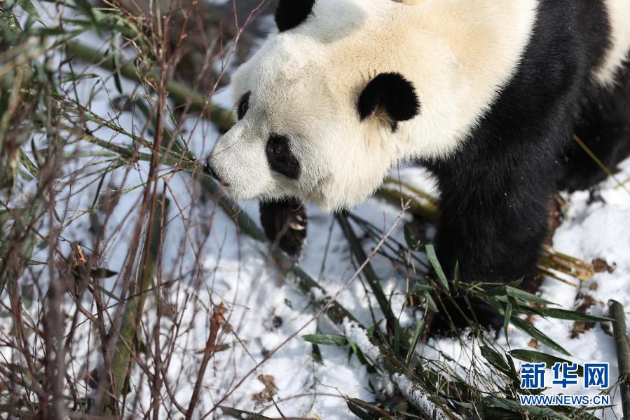 近日,受冷空气影响,青海省西宁市迎来降雪。西宁熊猫馆的四只大熊猫在雪天里享受着吃竹子、“打盹儿”的乐趣。
