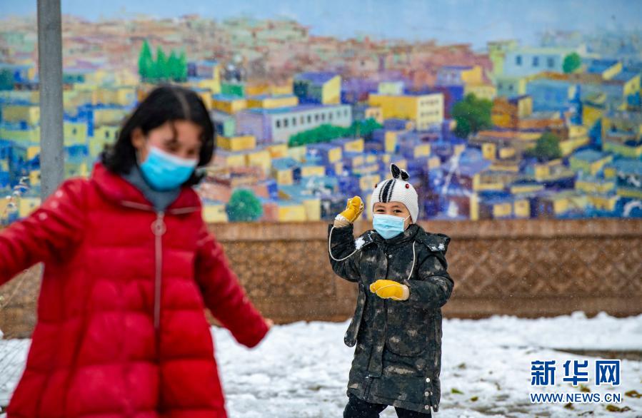 11月21日,小朋友在喀什古城景区内玩雪。