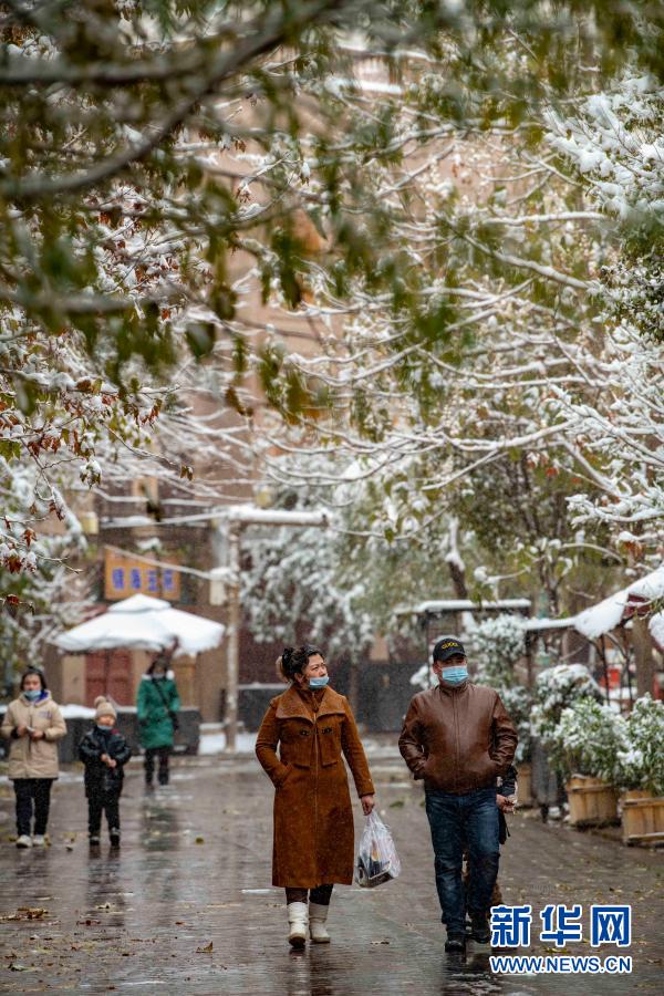 当日,新疆喀什地区迎来降雪天气,喀什市主城区银装素裹,别有一番韵味。喀什地区气象台发布道路结冰预警信息,提醒市民出行注意安全。