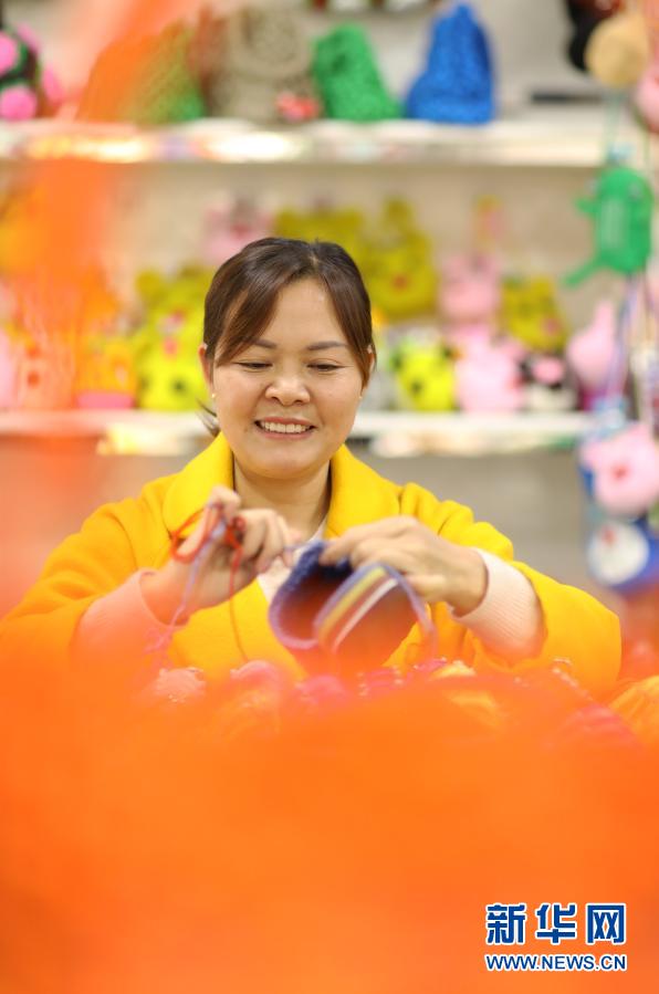 11月22日,在赤水市长期镇康桥社区,一名妇女在扶贫车间钩织产品。新华社发(王长育 摄)