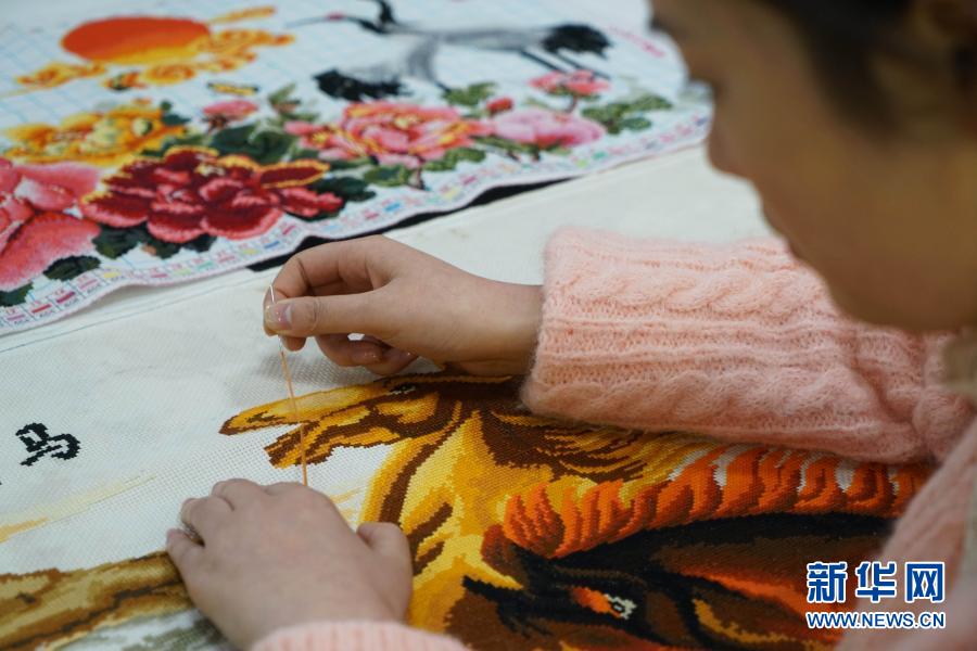 11月22日,在赤水市长期镇康桥社区,一名女青年在扶贫车间刺绣。新华社发(张鹏 摄)