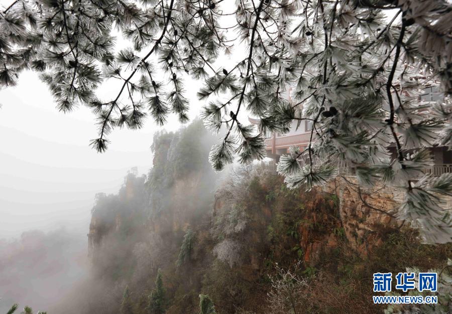 当日,受降温降雨天气影响,湖南张家界武陵源景区天子山迎来入冬以来首次雾凇景观,吸引众多游客纷至沓来。