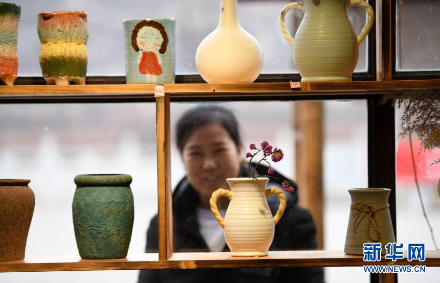 11月23日,一名游客在石家庄市井陉县秀林镇南横口村陶瓷水镇陶器商店观看商品。
