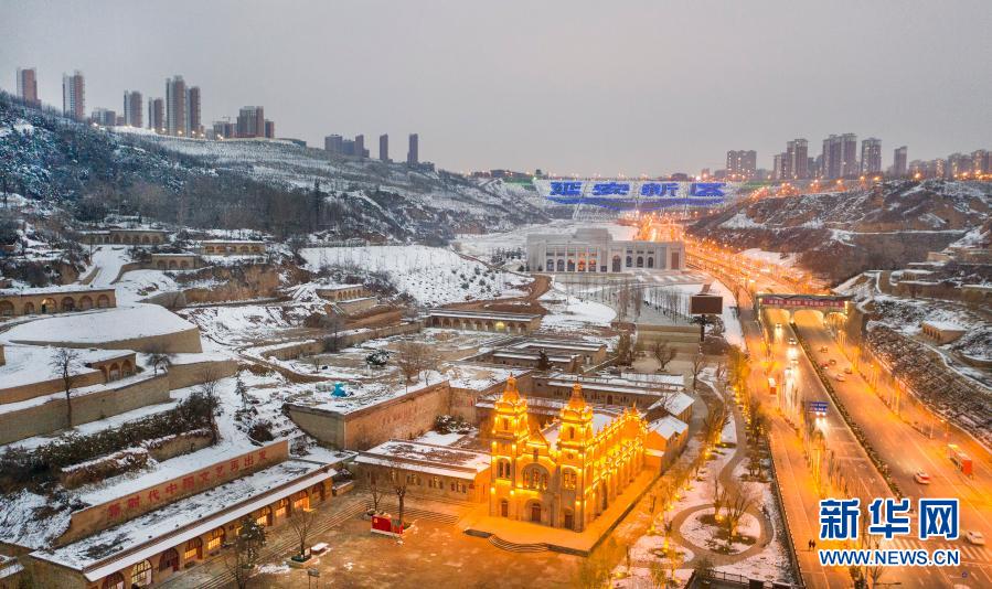 11月23日拍摄的雪后的延安鲁迅艺术文学院旧址(无人机照片)。