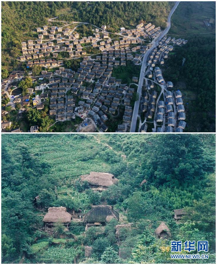 拼版照片:上图为2019年11月5日拍摄的贵州省荔波县瑶山瑶族乡拉片村拉懂吉生态移民新村(新华社记者杨文斌摄,无人机照片);下图为荔波县瑶山瑶族乡上世纪的茅草房民居(资料图片,荔波县瑶山瑶族乡人民政府供图)。