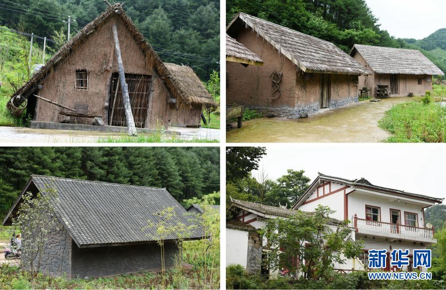 这张拼版照片显示的是贵州省赫章县海雀村的“四代房”:左上图为第一代杈杈房、右上图为第二代土坯房、左下图为第三代石墙房、右下图为第四代黔西北民居(图片均为2019年7月25日摄)。