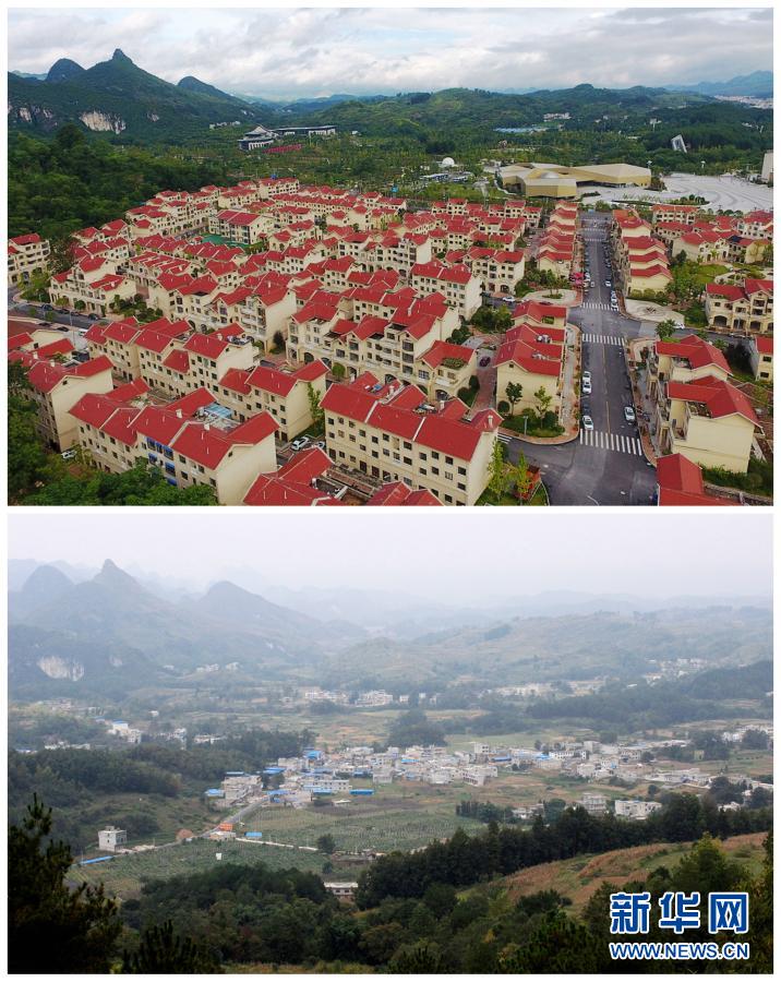 拼版照片:上图为2019年7月24日拍摄的贵州省平塘县克度镇航龙村新貌(无人机照片);下图为平塘县克度镇航龙村旧貌(资料照片)。