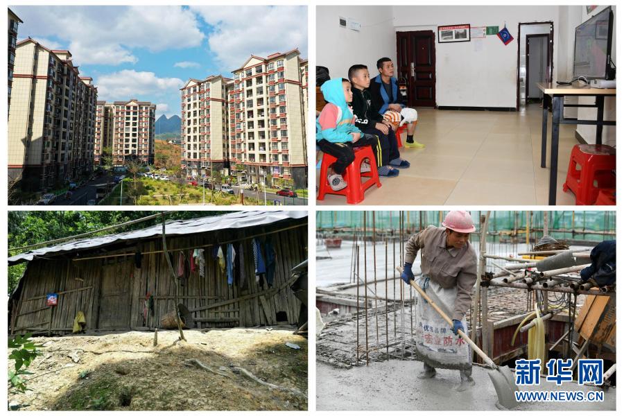 拼版照片:左上图为贵州省荔波县易地扶贫搬迁户何国强现在居住的荔波县兴旺社区(2019年11月7日摄);左下图为何国强搬迁前居住的荔波县瑶山瑶族乡拉片村拉朝组旧居(翻拍照片);右上图为何国强与孩子们在新居里看电视(2019年11月6日摄);右下图为何国强在荔波县城的建筑工地务工(2019年11月6日摄)。