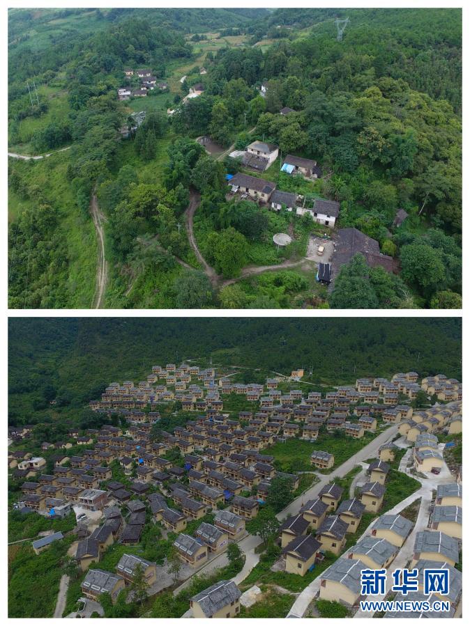 拼版照片:上图为贵州省荔波县瑶山瑶族乡居民此前居住的拉片村林场组全景;下图为瑶山瑶族乡拉片移民新村全景(均为无人机照片,2017年8月8日摄)。