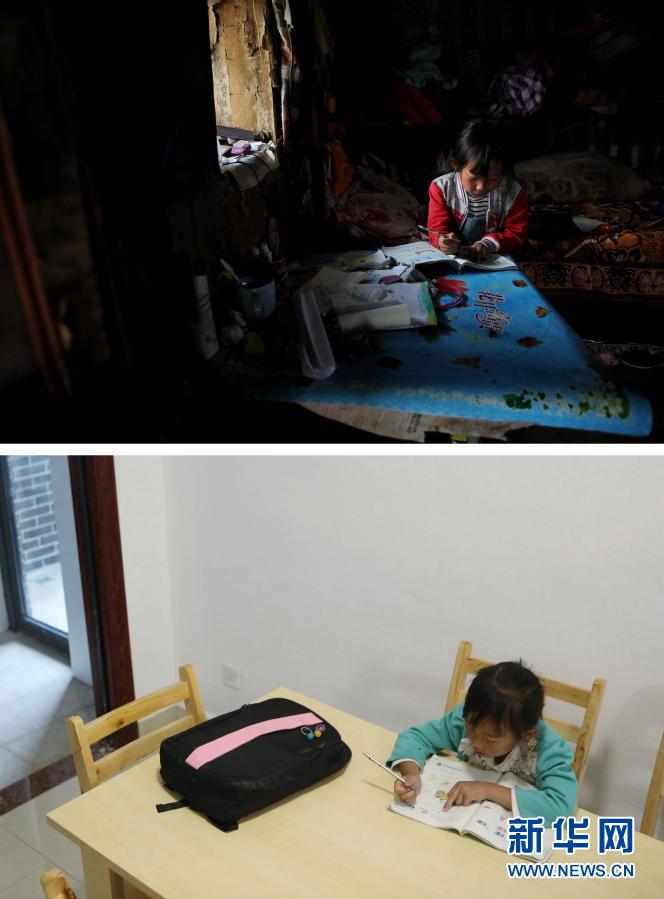 拼版照片:上图为贵州省黔西县金兰镇瓦房村哈冲组村7岁的李晓彤在哈冲组的旧居内做作业(2018年4月27日摄);下图为7岁的李晓彤在贵州省黔西县锦绣花都安置点新居内做作业(2018年5月7日摄)。