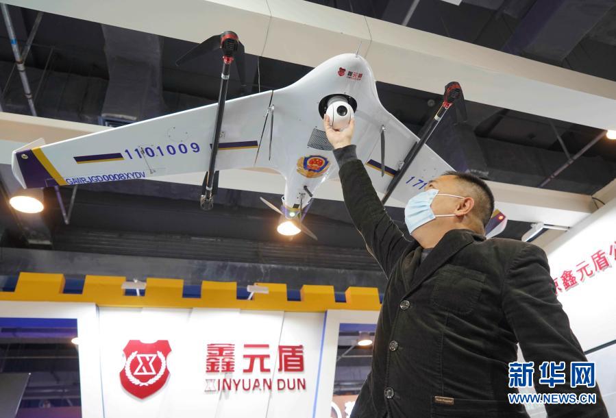 11月24日,在鑫元盾公共安全防范技术发展中心展台,工作人员在调整警用无人驾驶航空器的摄像头。